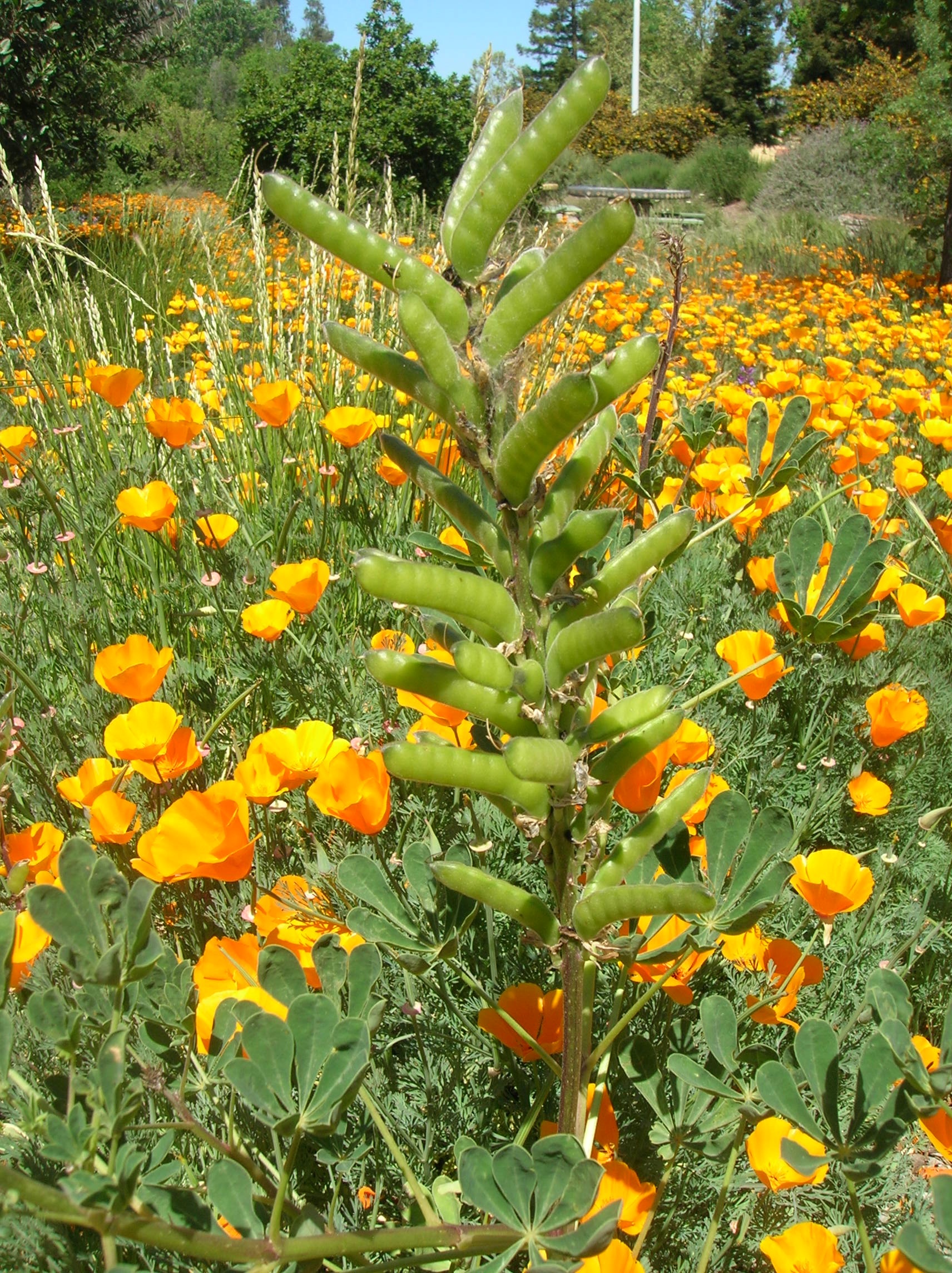 The Backstory Some couples just look good together. So it is with golden California poppies and purple lupines. Poppies and lupines constitute a classic wildflower combination for gardeners as well as for artists! In fact, the colors of the University of California, blue and gold, were chosen because the fields around the first campus (in 1868) reportedly were replete with blue lupines and golden poppies. (A few years ago, a hillside in north Livermore was also covered with lupines. It was a glorious site! Now it is covered by a parking lot, albeit with solar collectors above. I guess this is one form of progress.) Last year, a single purple lupine (Lupinus succulentus) found its way into the woodland section of the Granada Native Garden. This year, its progeny are spreading themselves around among the poppies (lupines may do better when they self-seed than when we try to help them). Hopefully this display of color will become a regular annual attraction at the Granada Native Garden.