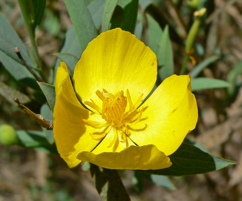 The bush poppy (Dendromecon rigida) really is a poppy (Family Papaveraceae), it just doesn’t look like the poppies we are accustomed to seeing. And, strictly speaking, it’s supposed to bloom from February to May or June. But the bush poppy (also called a tree poppy) at the Granada Native Garden doesn’t know that — it seems to be in bloom all year round, more or less. More during its assigned blooming season. The bush poppy is one of those plants at the Granada Native Garden that never receives any water (once it is firmly established) outside of the rainy season — no summer water. It grows well in both sun or shade, but seems to prefer sunny locations (which match its brilliantly sunny blossoms!), as long as the drainage is very good. The only care we give it in exchange for its colorful addition to the Garden is to remove the older, dead leaves, which are slow to fall off and need to be removed by hand from time to time.