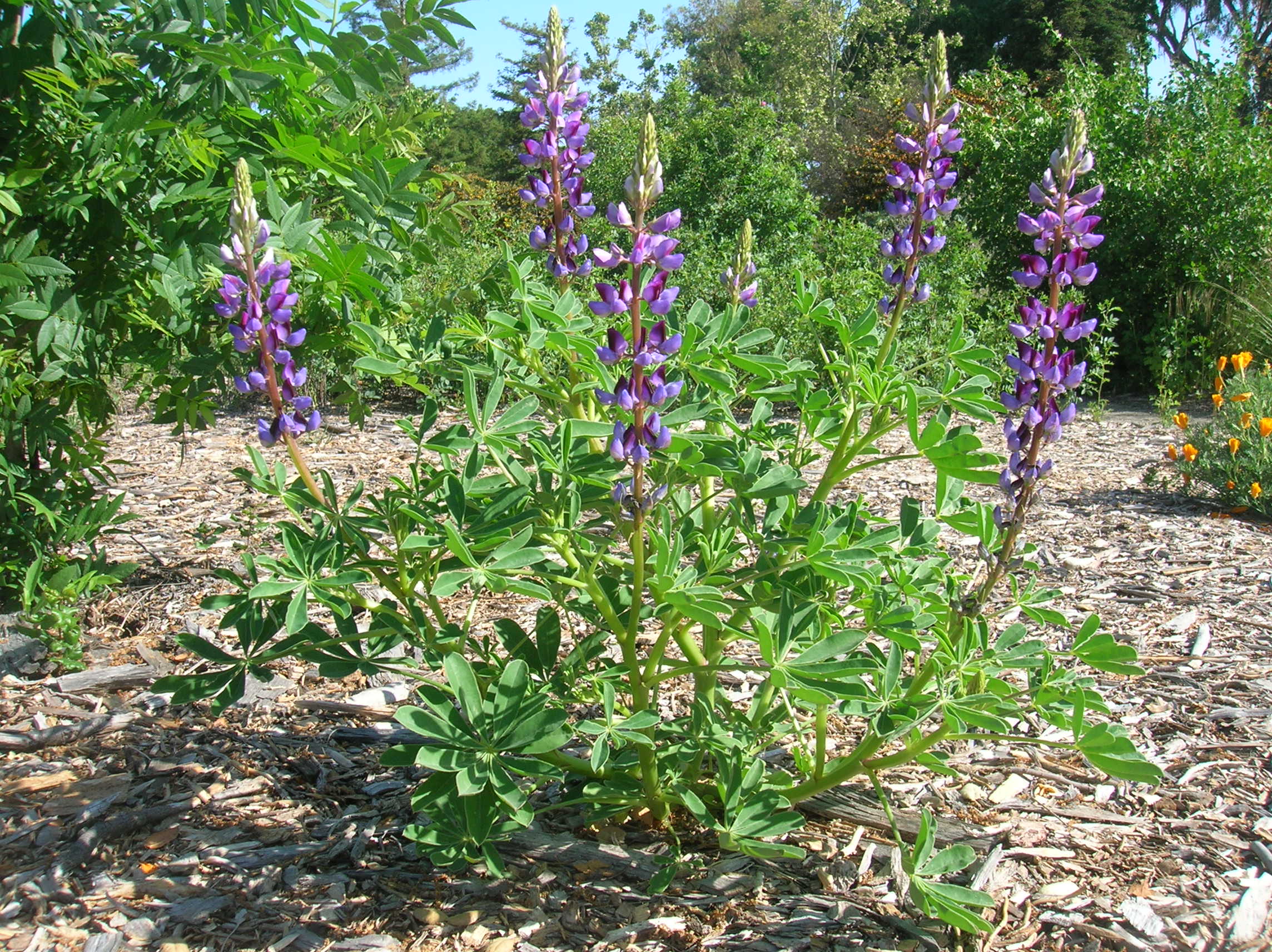 During the past two years, the GNG staff has tried to add a wider selection of native wildflowers to the Garden. Among the additions are more lupine (Lupinus succulentus, at the right → ), as well as five-spot (Nemophila maculata, below ↓ at the left), baby blue eyes (Nemophila menziesii), goldfields (Lasthenia