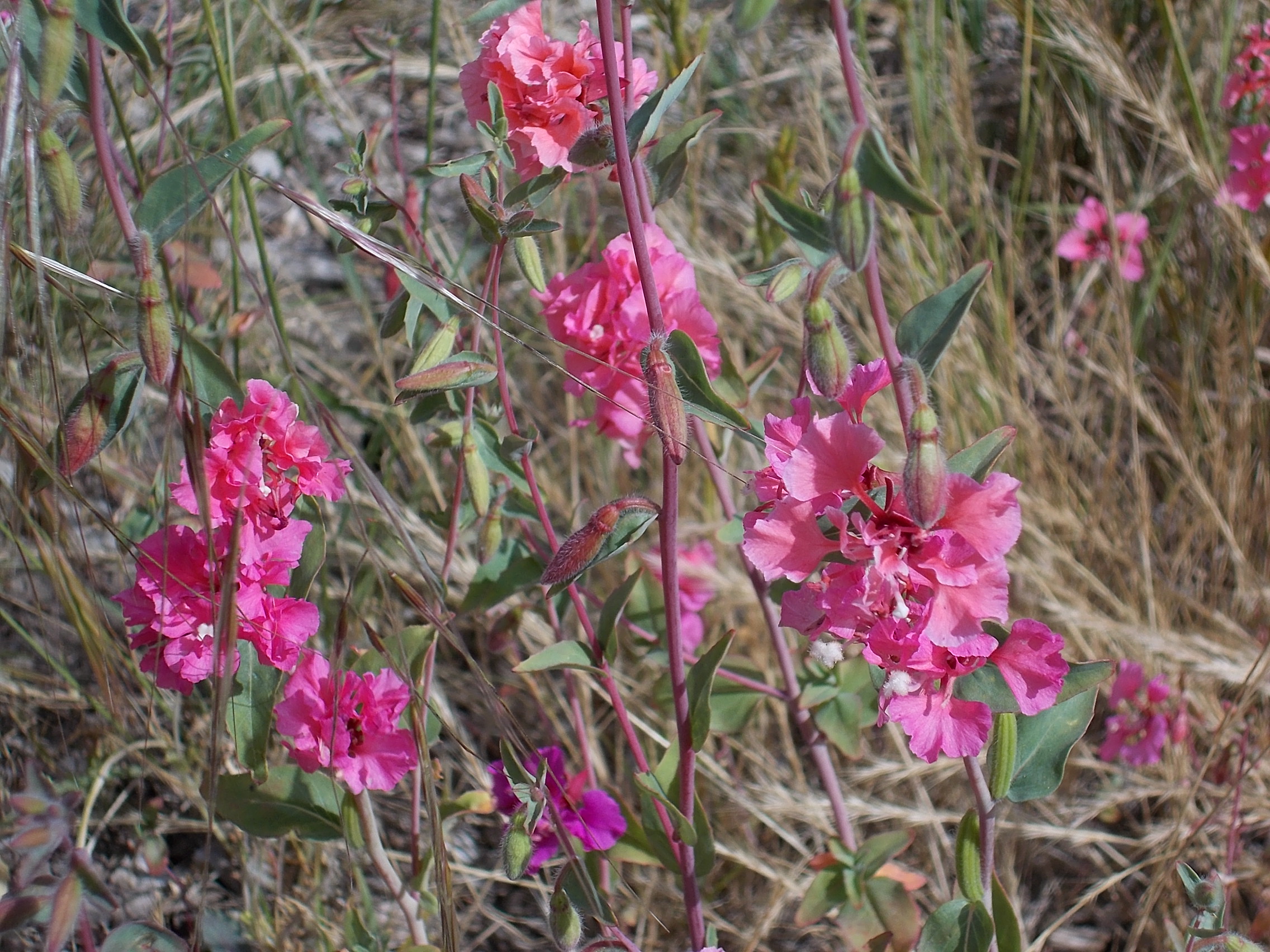 This is one form of the genus Clarkia that was featured in an earlier post (“Clarkia – A Native Flower with a History”, posted on May 4, 2014, archived in May, 2014). The flower has its petals arranged in a fan-like arrangement, rather than a cup-shape. The Clarkias bloom later in Spring, but the mountain garland (Clarkia unguiculata) blooms earlier than the later-blooming “Farewell-To-Spring” (Clarkia amoena).