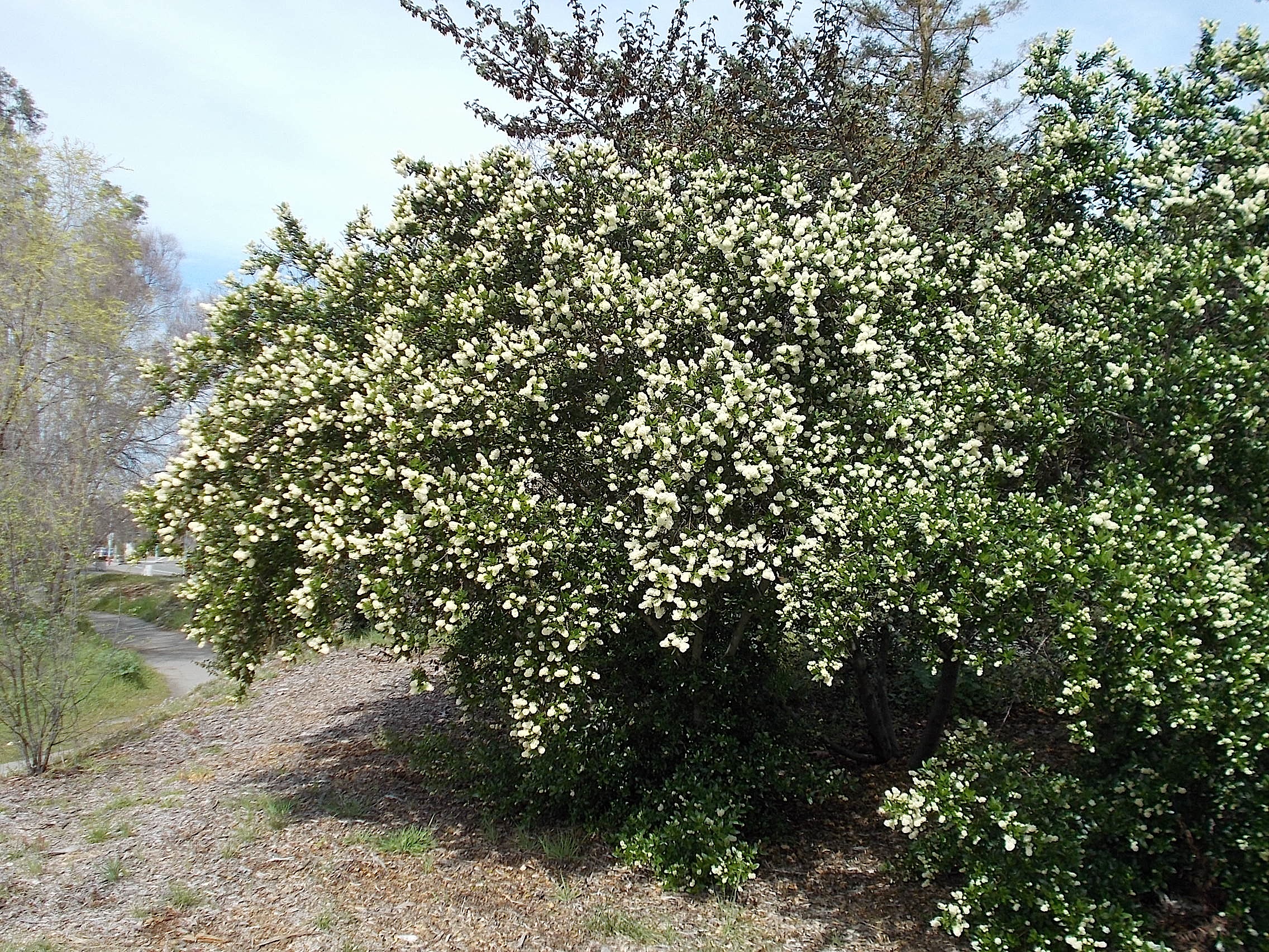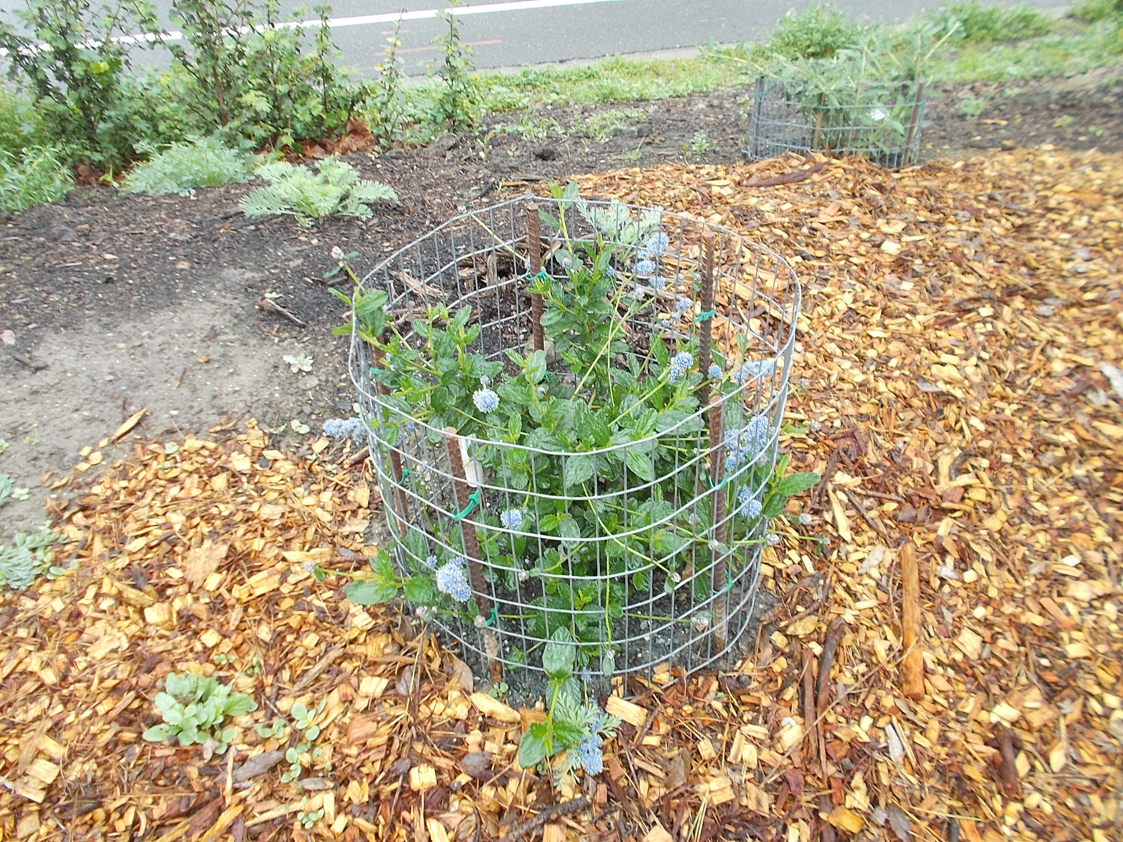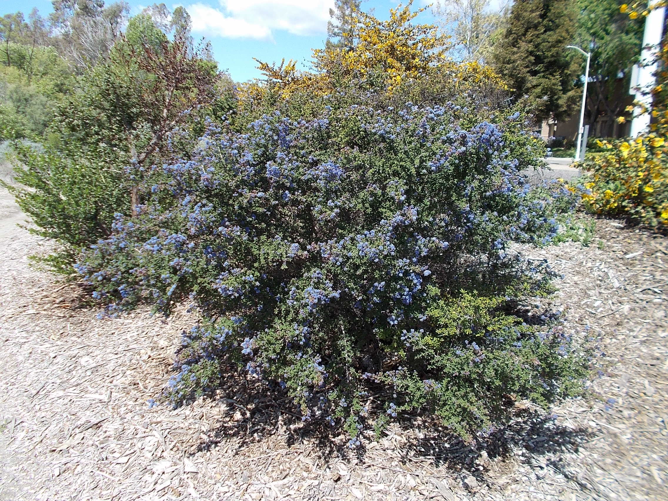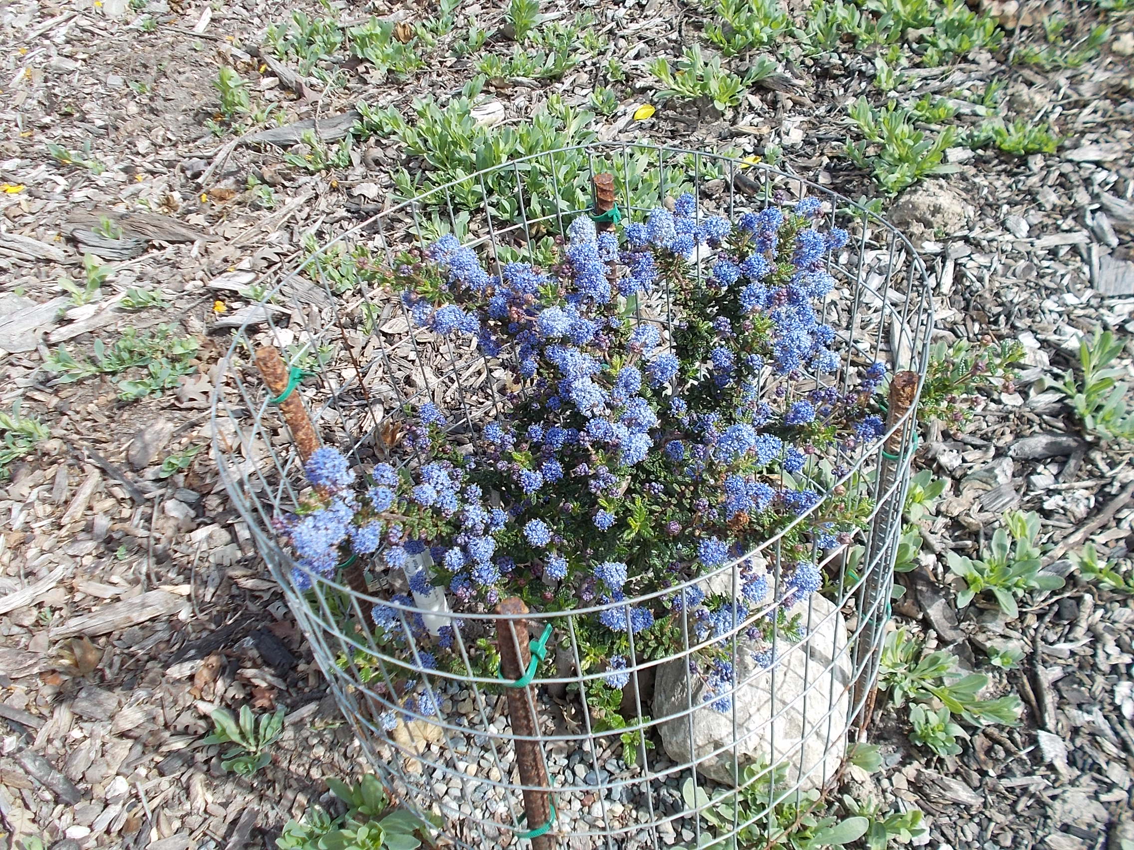 Strolling Down Lilac Lane …                                                                                                        … otherwise known as the chaparral section (G1-4), you can find five varieties of California lilac (genus Ceanothus), all in stunning full color now.  One white variety, named ‘Snow Flurry’ (C. thyrsiflorus) dominates the far north end of the GNG, but there is a smaller one half-way down, right along the path.  They were covered with busy bees gathering nectar when I took this picture!Snow flurry             It’s hard to miss the dark blue ‘Dark Star’, even from a distance.  A bit farther down the path is the younger (planted just this Fall) but precocious ‘Julia Phelps’ in its protective cage.