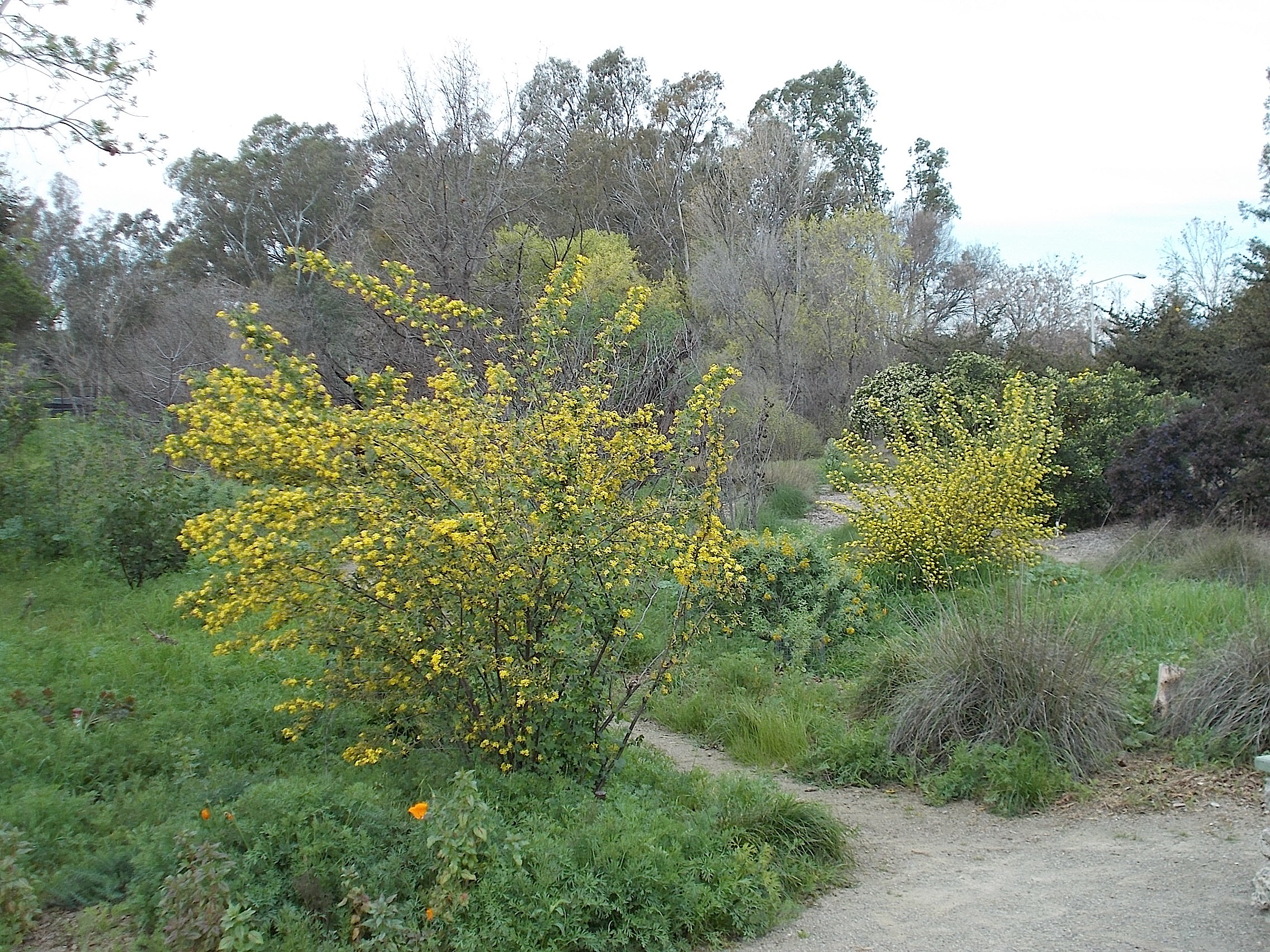 So what would justify a visit to the Granada Native Garden at this time this year?  There are always the California poppies, which threaten to overwhelm GNG every year and actually do have to be restrained before they smother other notable members of the Garden.  They are just now starting to bloom.                                                                       Cal. poppies            Equally striking are the island bush poppy (Dendromecon harfordi), which is actually a member of the same botanical family (Papaveraceae) as the California poppy, in spite of its different appearance, and the early-blooming golden currant (Ribes aureum gracillimum).  Both have bright yellow flowers, and you can’t miss them.  (Click the photos to enlarge them.)
