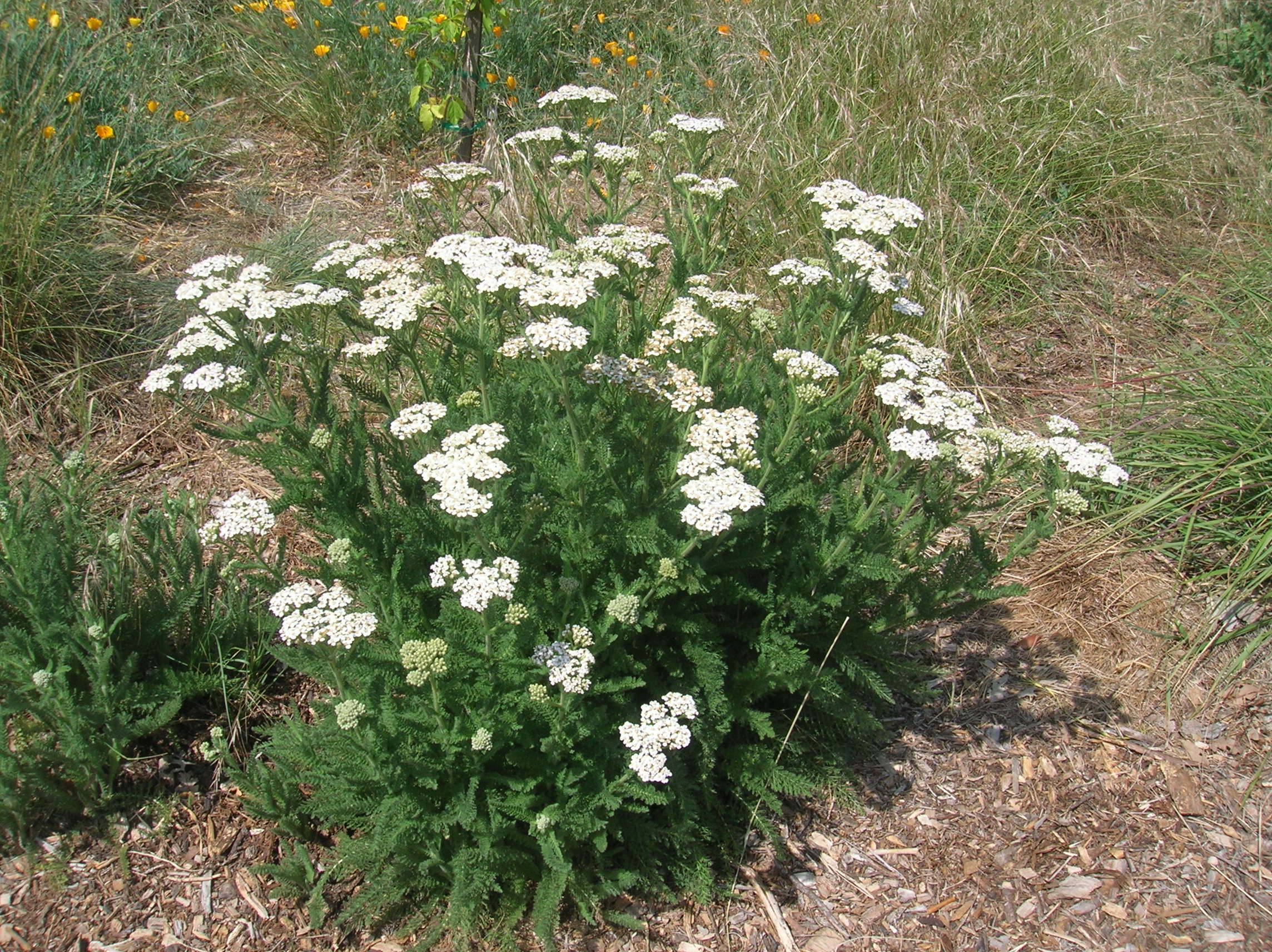 The columbines are hiding among other vegetation in the Woodland section near the table area, under the sycamore.  The yarrows are in different places along the paths, but also in the table area.