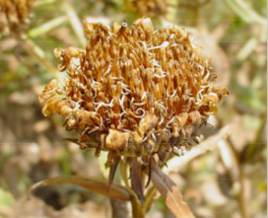 But gumplant differs from other sunflowers in two unusual ways. The more peculiar characteristic is a gummy white substance produced by the immature flowers. With some imagination, you can pop one of these blossoms into your mouth and enjoy a native plant version of chewing gum, altho the experience lasts for only about 15 seconds. The “gum” disappears as the flowers mature. It is likely that the substance serves to protect the immature flowers from disease and/or predators. In fact, the plant does have a number of medicinal qualities that are of use to humans; more about that later.