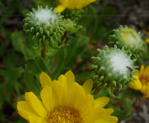 But gumplant differs from other sunflowers in two unusual ways. The more peculiar characteristic is a gummy white substance produced by the immature flowers. With some imagination, you can pop one of these blossoms into your mouth and enjoy a native plant version of chewing gum, altho the experience lasts for only about 15 seconds. The “gum” disappears as the flowers mature. It is likely that the substance serves to protect the immature flowers from disease and/or predators. In fact, the plant does have a number of medicinal qualities that are of use to humans; more about that later.