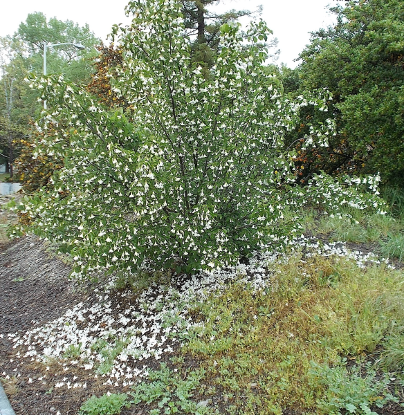 According to California Flora Nursery, Styrax redivivus (also called Storax and formerly known as S. officinalis) is “a beautiful but little known California native that is slow to mature but worth the wait. Develops into a graceful multi-stemmed deciduous shrub. Dark green rounded leaves clothe the smooth gray branches. … We have observed hummingbirds and pipevine swallowtail butterflies nectaring on styrax blossoms.” [One morning, a well-known local grower of California natives stopped by the GNG when he saw the snowdrop in bloom and asked me what it was. I was a new worker then, and I didn’t know]. If you are fortunate to experience a snowdrop in full bloom, take advantage of the opportunity to examine the fragrant, snowy-white bell-shaped blossoms up close. Once they are gone for the season, you will look forward to seeing them again next year.